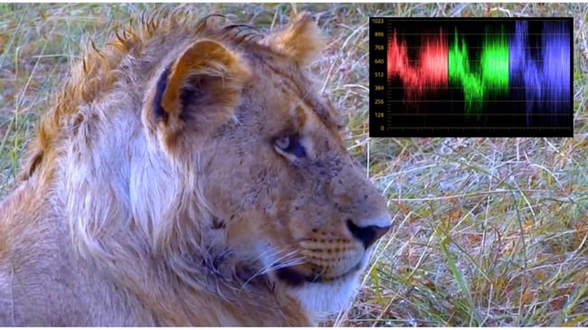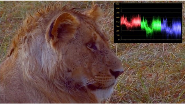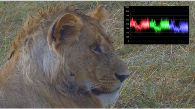 Let’s start out with this log file of the lion. If we compare the image to what we see on the scope, we can see the effects of the log file. The effects of the log file can be compensated by adding a log-to-linear LUT, or we can simply compensate using the primary colour correction controls. What we are seeing here is the lift elevated, luminance compressed and the gamma curve expanded.