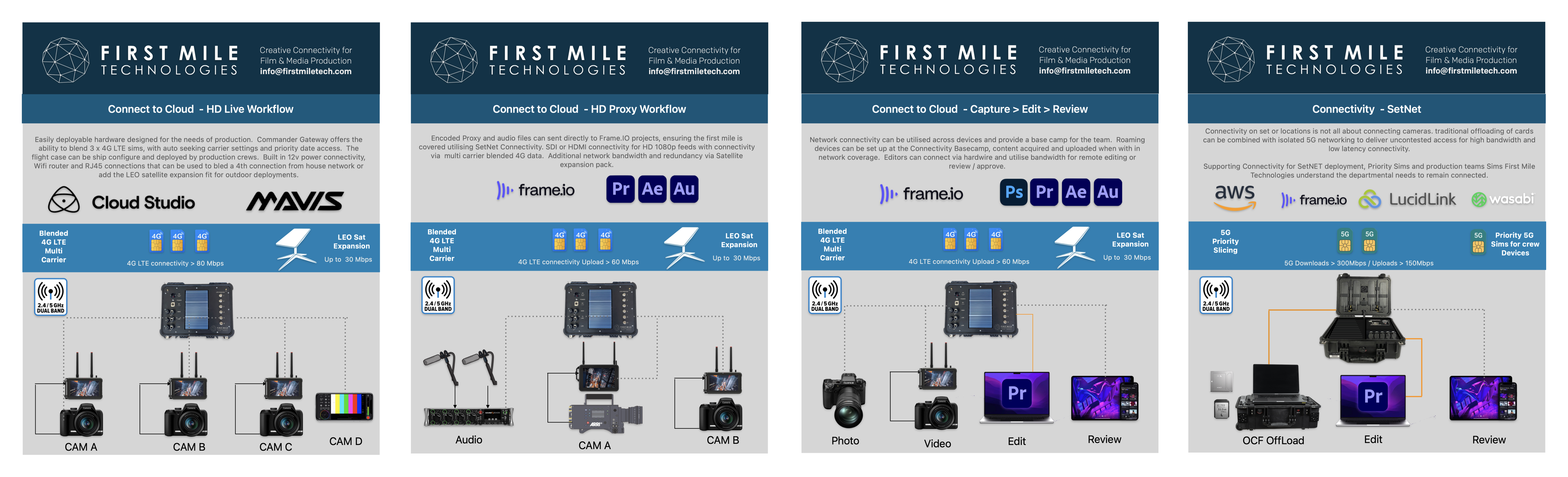 But there is still the question of how you connect to the cloud when even the fast mobile networks are designed for short, bursty, transactional data and not large, long media files. This is the problem that First Mile is designed to solve with scalable options for a wide range of operating scenarios. The company’s mobile data products use professionally configured SIM cards, dedicated hardware and technical measures to ensure constant, high-bandwidth connectivity.