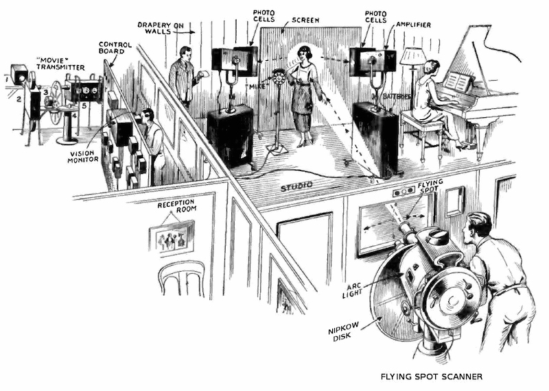 A viewer’s mechanical television set would consist of a radio receiver, a neon lamp and an upright Nipkow disc of a foot or two in diameter. The lamp – positioned behind the spinning disc – would fluctuate in brightness according to the radio signal.