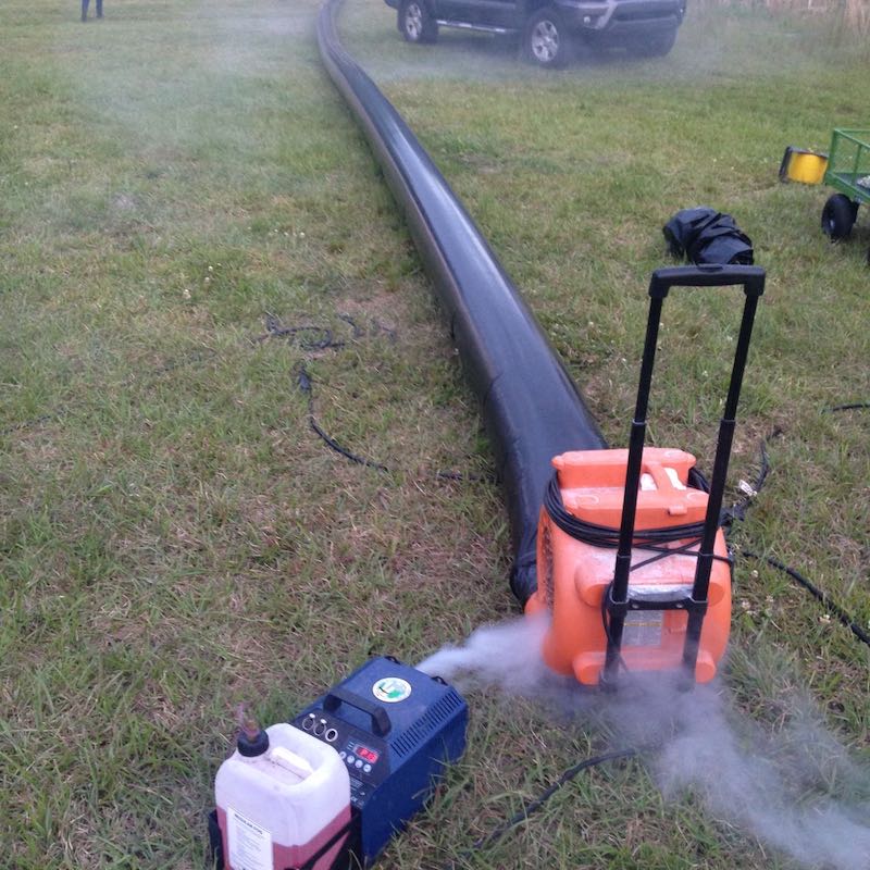 Outdoors, however, hazers are ineffective. An Artem or two will work well for smaller exterior scenes; for larger ones, a Tube of Death may be the best solution. This is a long, plastic inflatable tube with regularly-spaced holes, with a fan and an electric smoke machine at the end. It ensures that smoke is distributed evenly over a large area.
