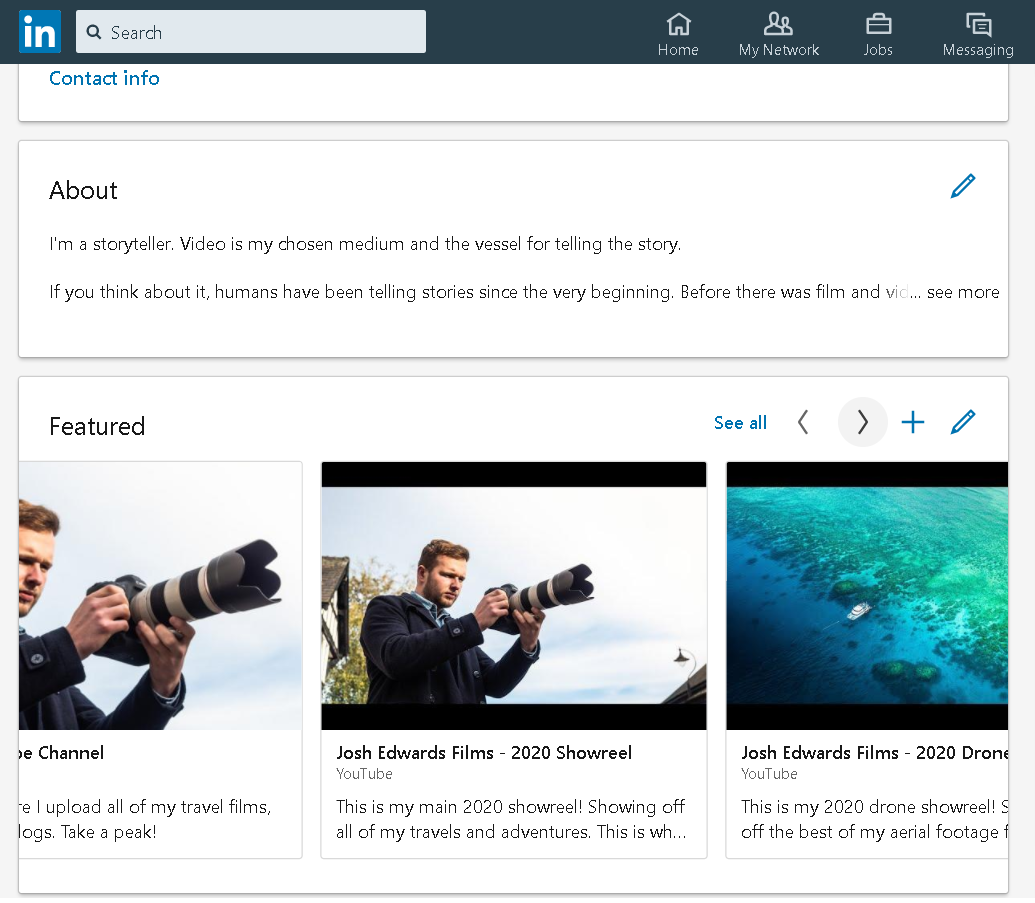 Top tip: utilise the ‘featured’ section. If someone is viewing your profile, they can find links to your website, your YouTube channel and all your showreels very quickly. It’s perfect.