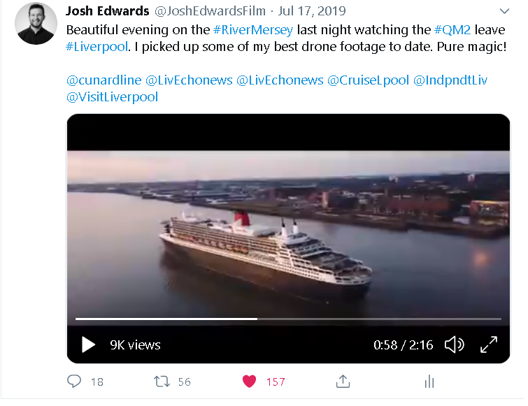 Twitter can also be a surprisingly underrated place to get your work seen. You never know what might gain traction. As an example, in 2019 The Queen Mary 2 was sailing out of Liverpool. I took the time to head down to the river and filmed the drone footage below.