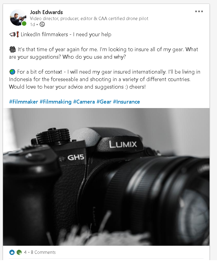 I’ve used the platform to grow a solid network of peers and contacts. I can directly message these people and reach out to them. I can find out if they’d like to work together, or shoot them a question. For example, I recently asked for advice about who to insure my filmmaking equipment with. Straight away, I received real-world feedback from my peers who are out there, doing what I do.