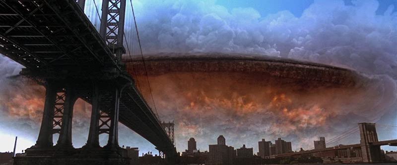 By 1996, CGI was replacing many traditional effects, but the summer blockbuster Independence Day used a healthy mix of both. To generate the ominous clouds in which the invading spacecraft first appear, the crew built what they called the “Phenomenon Rig”. This was a semi-circle of halogen lights and metal piping which was photographed in a water tank. Paint was injected into the water through the pipes, giving the appearance of boiling clouds when lit up by the lamps within. This was digitally composited with a live-action background plate and a model shot of the emerging ship.